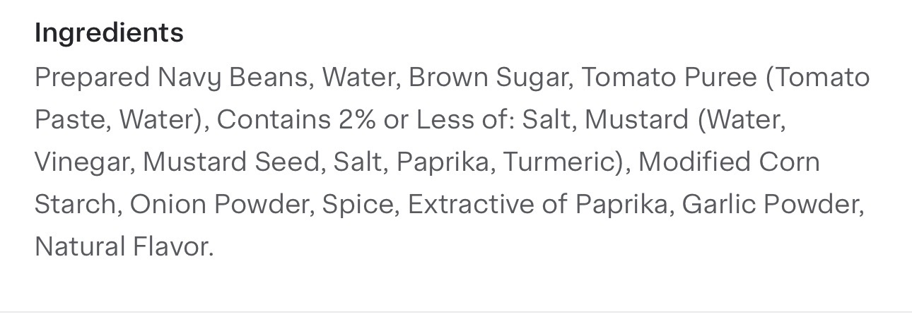prepared navy beans, water, brown sugar, tomato puree(tomato paste, water), salt, mustard (water, vinegar, mustard seed, salt, paprika, turmeric). modified corn starch, onion powder, spice, extractive of paprika, garlic powder, natural flavor