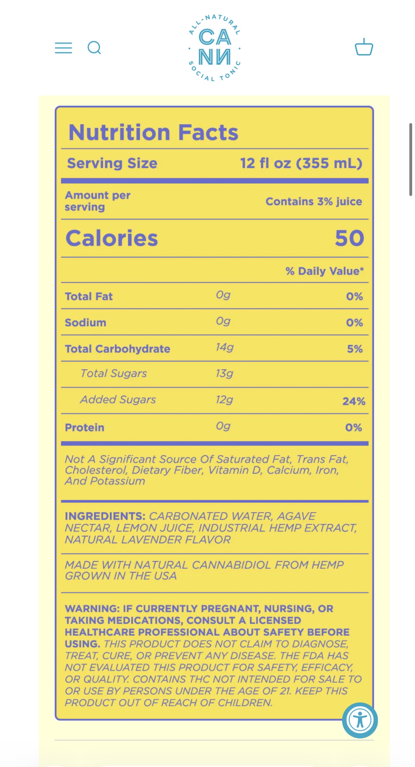 INGREDIENTS: CARBONATED WATER, AGAVE NECTAR, LEMON JUICE, INDUSTRIAL HEMP EXTRACT, NATURAL LAVENDER FLAVOR