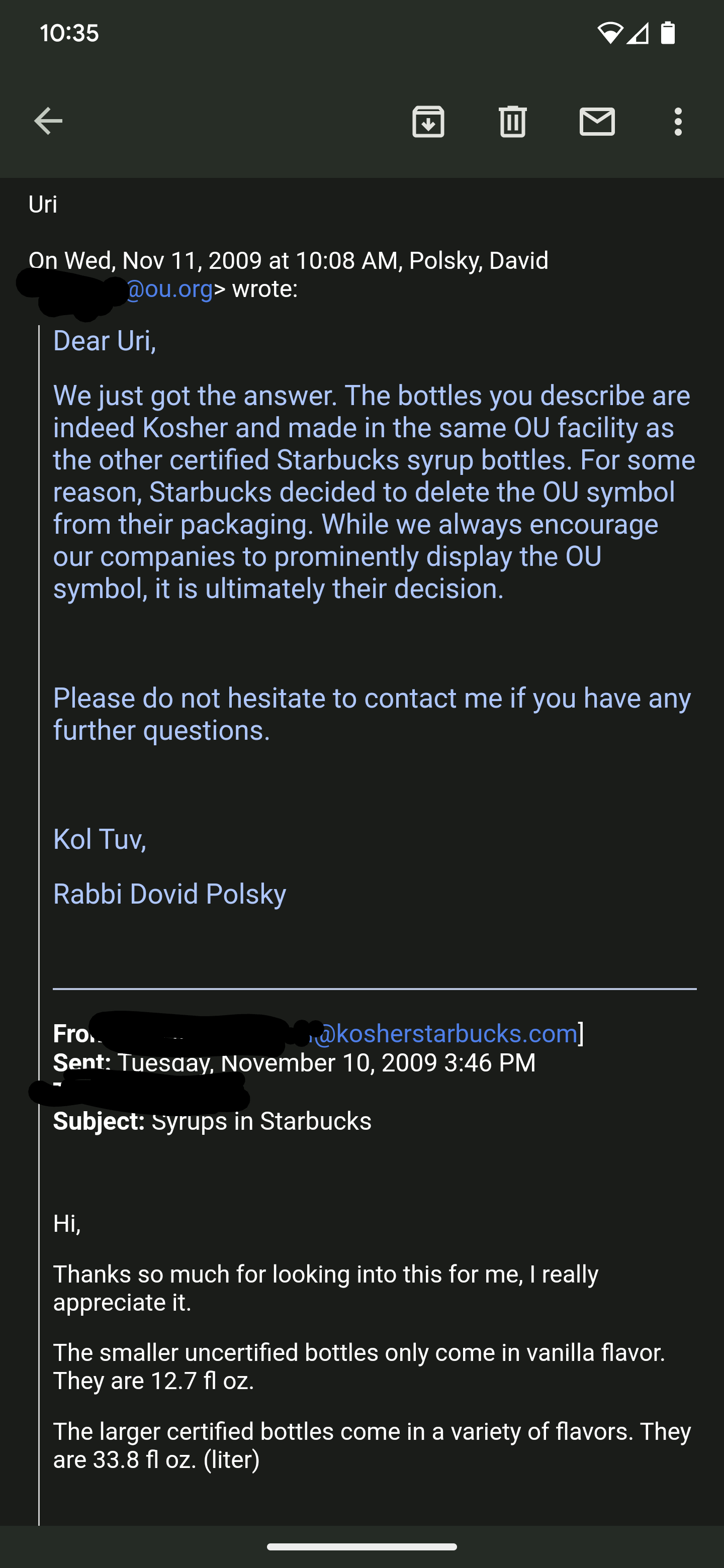 The screenshot of the email is from 2009. Is that the last time you got the update about this (flavored syrups) from Starbucks? I’d love to know, thank you!