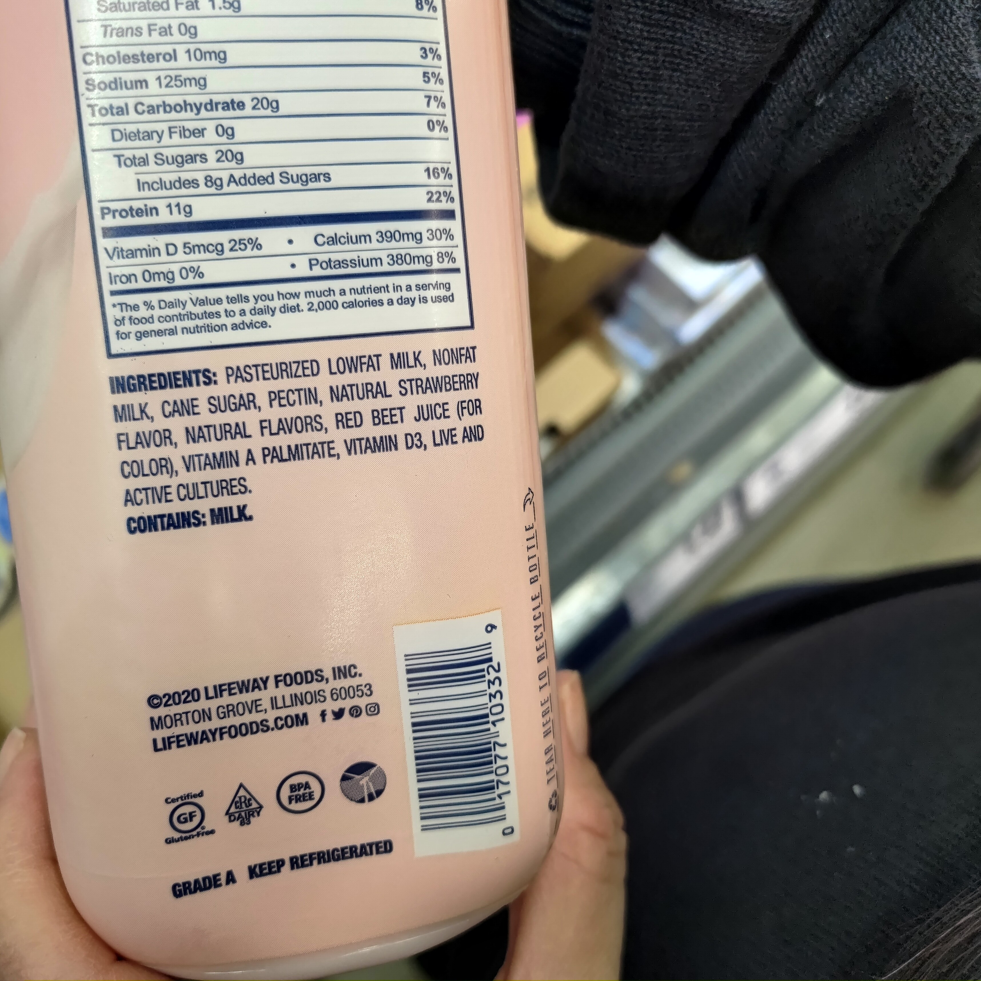 Pasteurized low-fat milk, non fat milk, cane sugar, pectin, natural strawberry flavor, natural flavors, red beet juice, vitamin A palminate, vitamin d3, live and active cultures