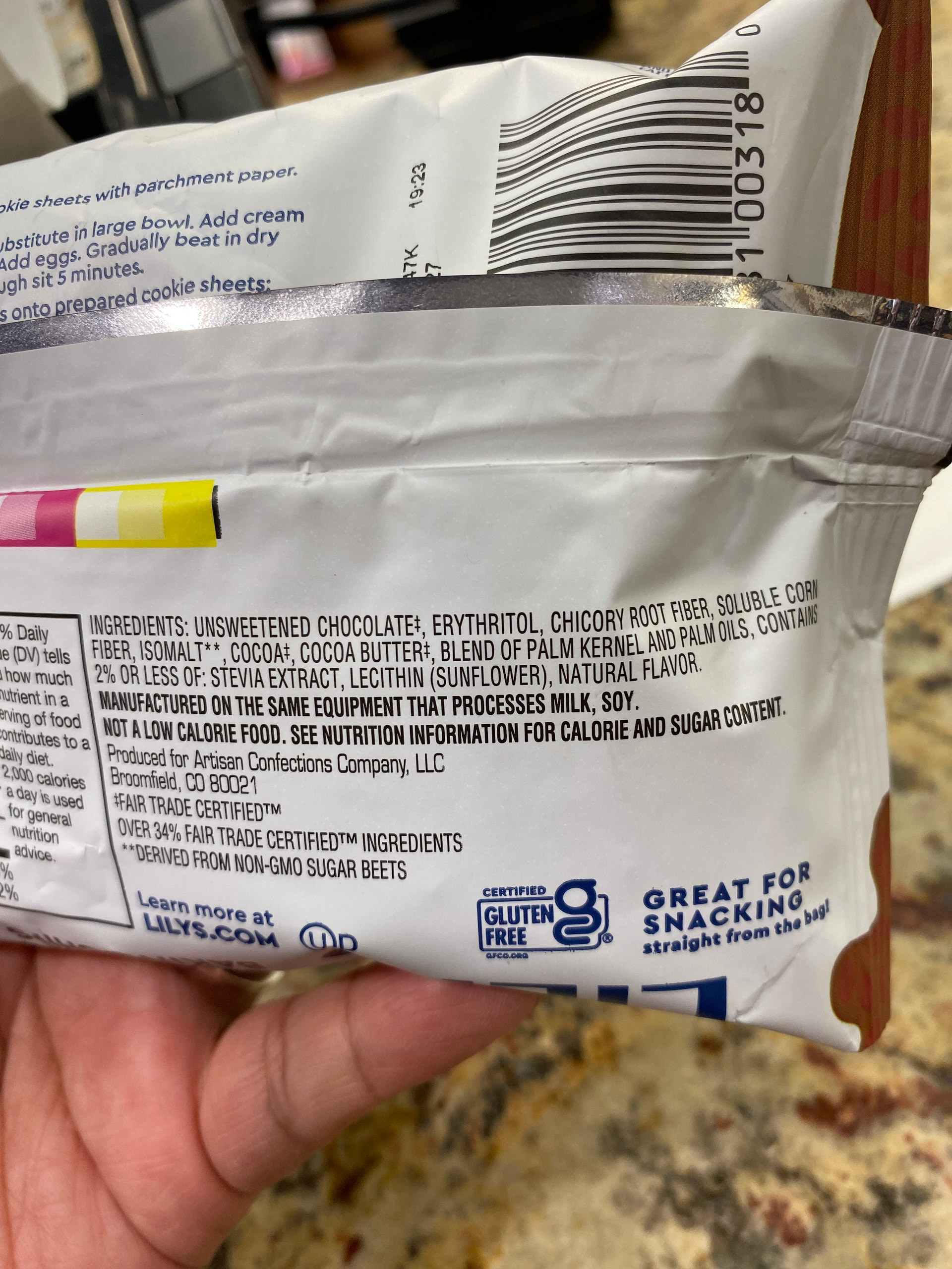 this too? Ingredients: Unsweetened chocolate, erythritol, chicory root fiber, soluble corn fiber, isomalt, cocoa, cocoa butter‡, blend of palm kernel and palm oils, contains 2% or less of: stevia extract, lecithin (sunflower), natural flavor.