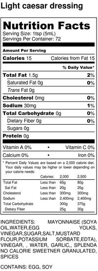 Kosher 12 oz Lite Caesar Dressing Ingredients Mayonnaise, water, egg yolk, vinegar, sugar, salt mustard flour
