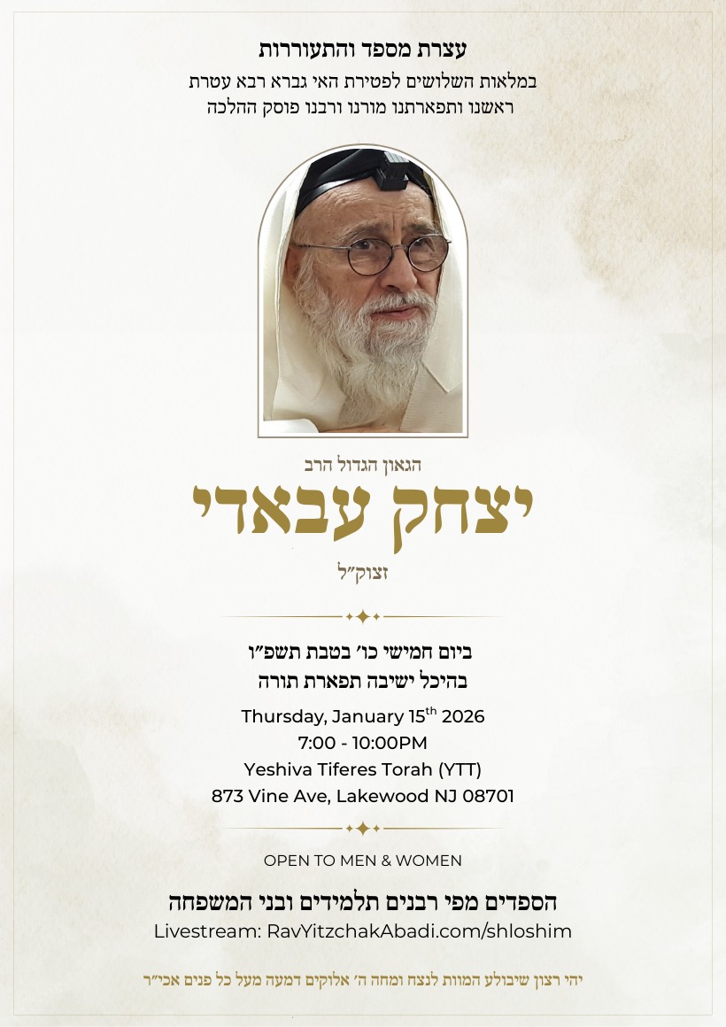 The family is making a shloshim event at Yeshiva Tiferes Torah (YTT) in Lakewood on January 15th at 7pm