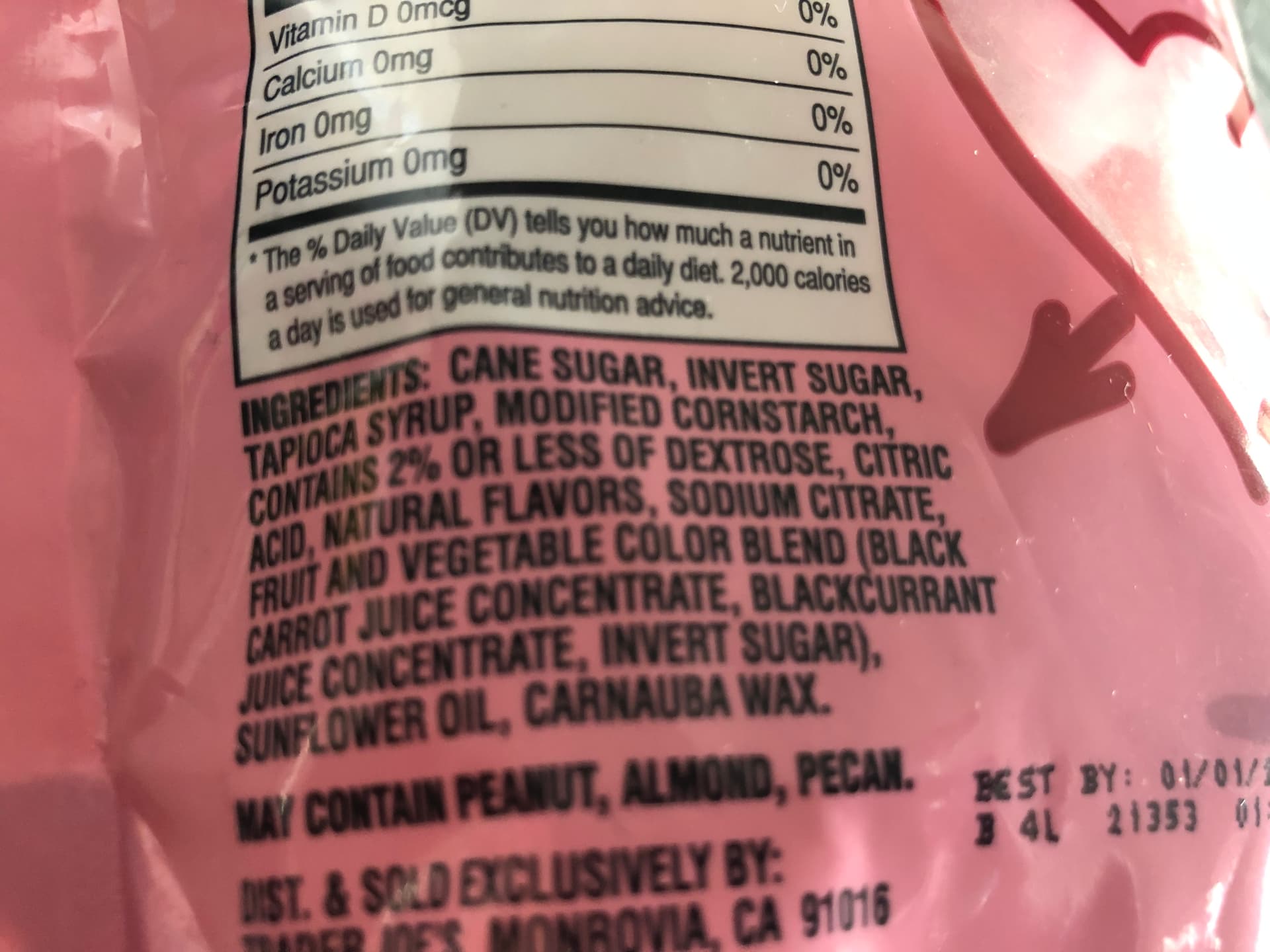 Is this K for P? Ingredients: cane sugar, invert sugar, tapioca syrup, modified cornstarch, contains 2% or less of dextrose, citric acid, natural flavors, sodium citrate, fruit and vegetable color blend (black carrot juice concentrate, blackcurrant juice concentrate, invert sugar) sunflower oil, carnauba wax