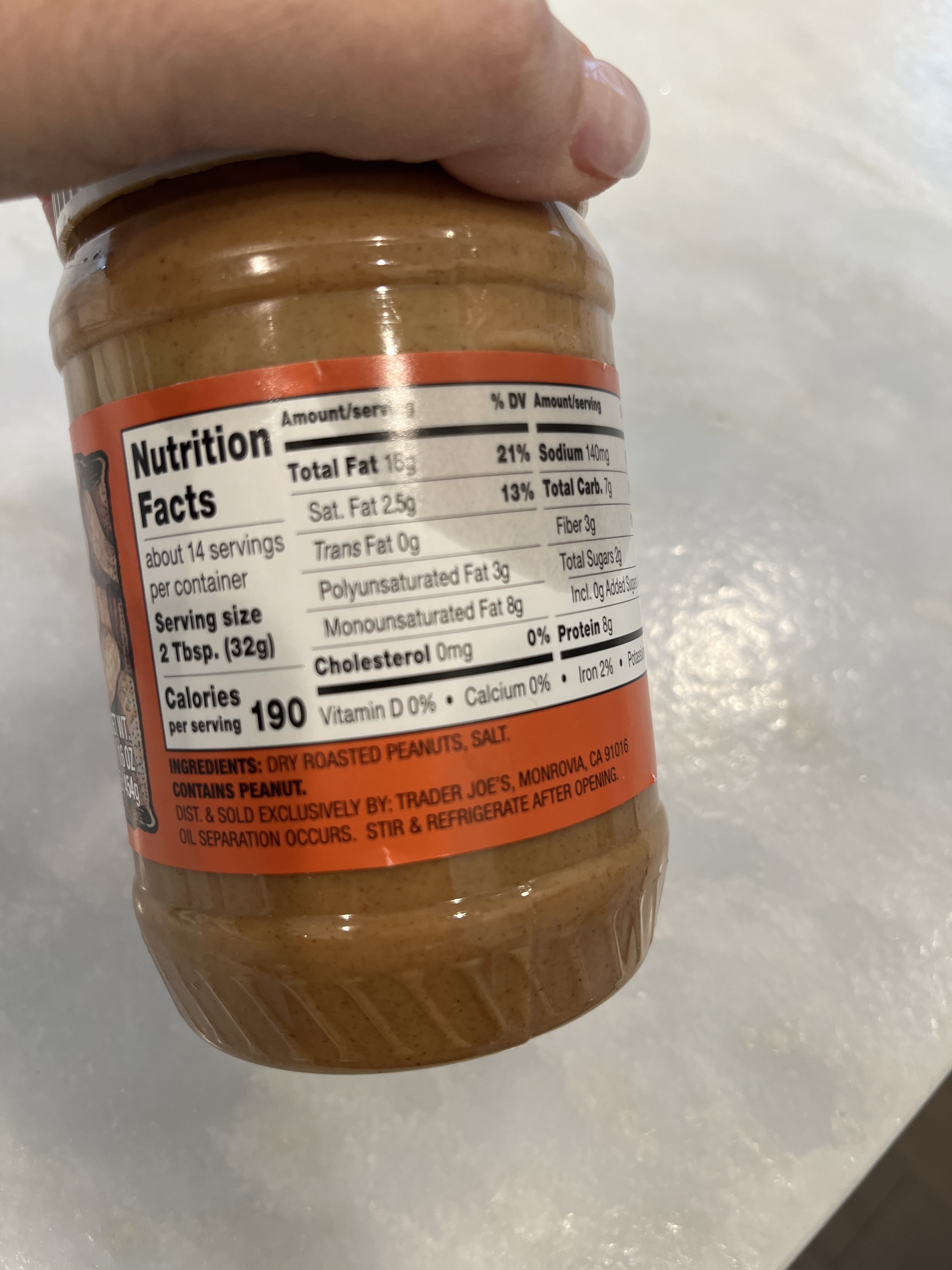 Trader Joe’s creamy peanut butter From blanched peanuts, salted