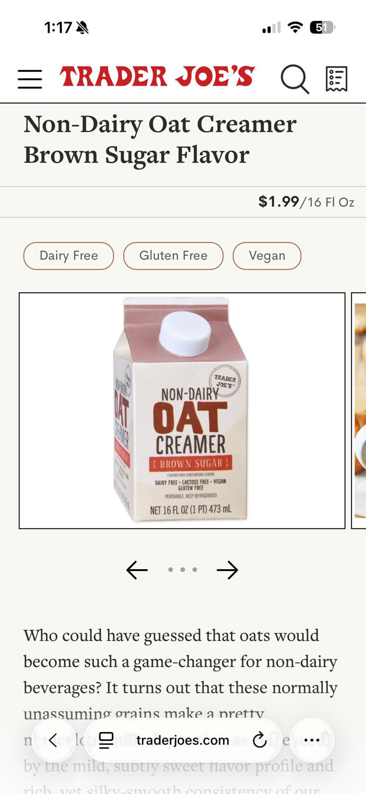 trader joes brown sugar oat creamer glutten free—
